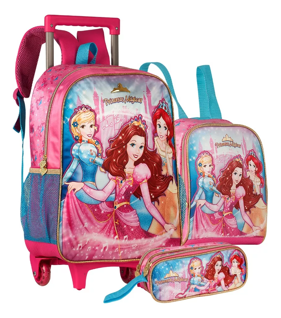Kit Mochila com rodinhas, lancheira térmica e estojo Escolar Princesas Mágicas volta as aulas menina criança presente