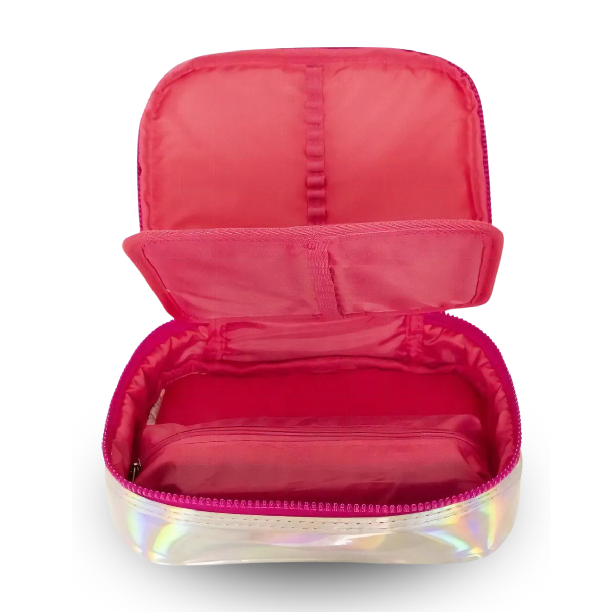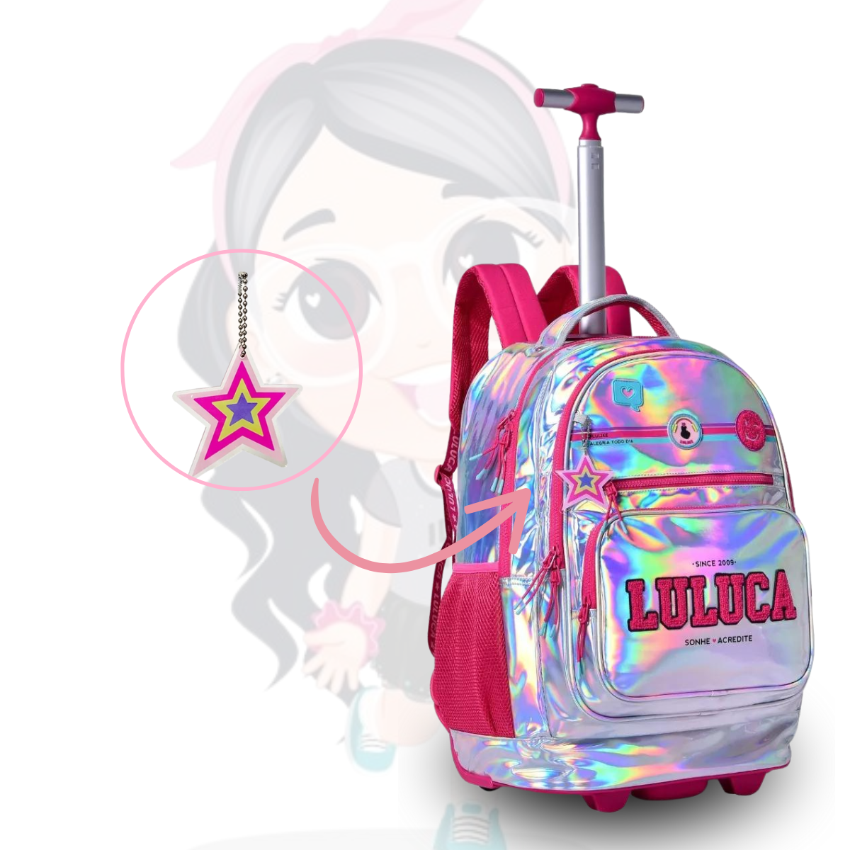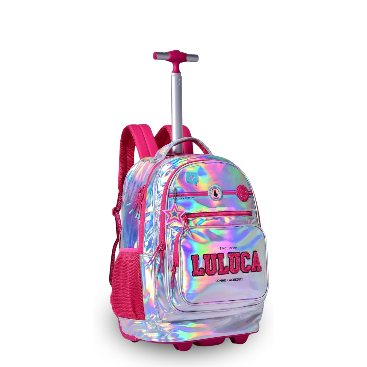 A moda holográfica é uma tendência que expressa muita personalidade e atitude. O efeito holográfico é reflexivo, quase como uma mistura entre glitter e espelho. A Clio Trouxe O Kit Mochila de Rodinhas, Lancheira e Estojo da Luluca confeccionados em PVC Holográfico com Silk, Tags e Patches no painel frontal e zíper emborrachado. A Mochila possui puxador em metal, proteção para rodas e alças, chaveiro personalizado em Acrílico e alças acolchoadas. Lancheira Térmica com alça Tira colo e Estojo Box com elástico que comporta 36 lápis para você organizar todo seu material.