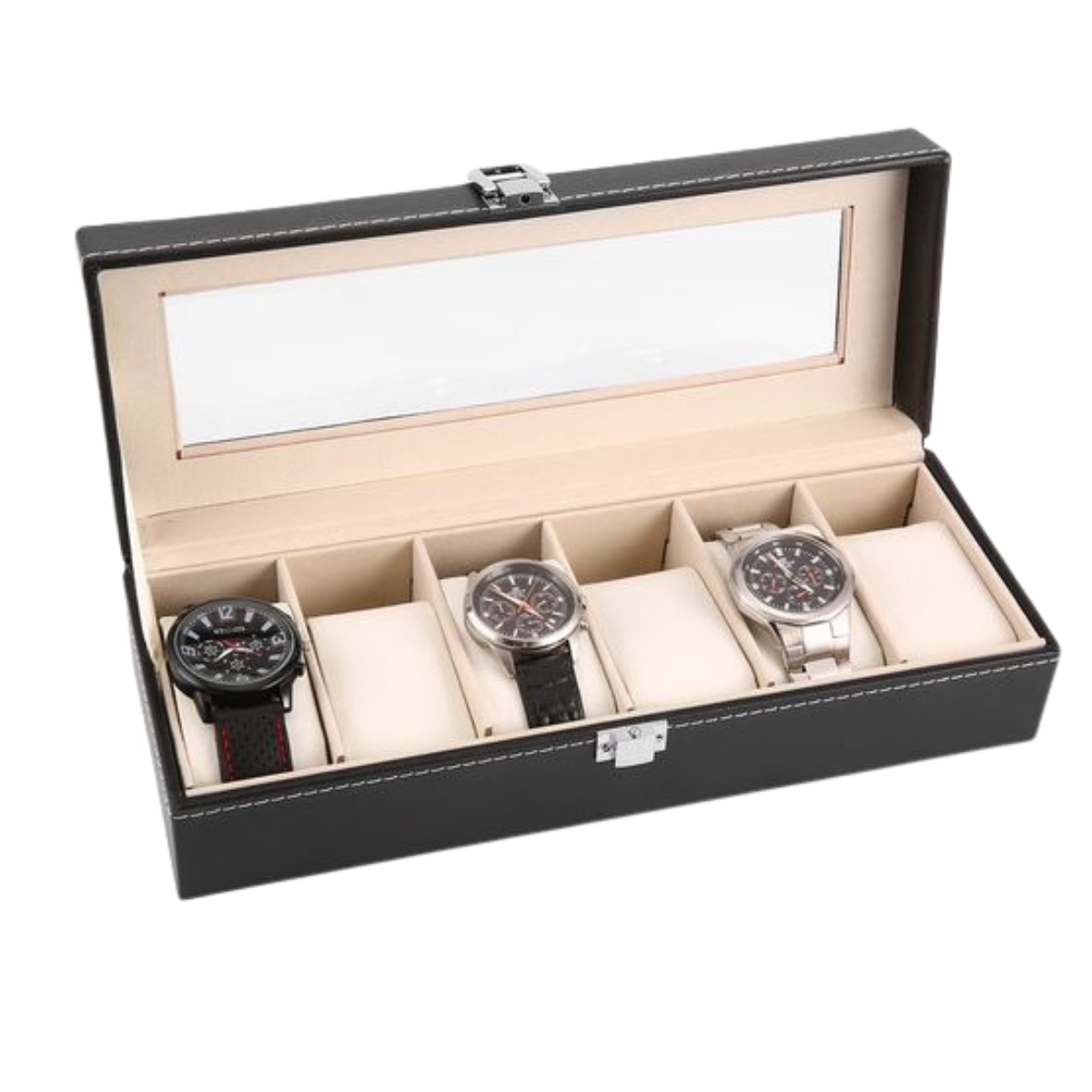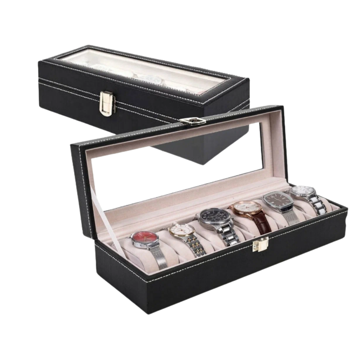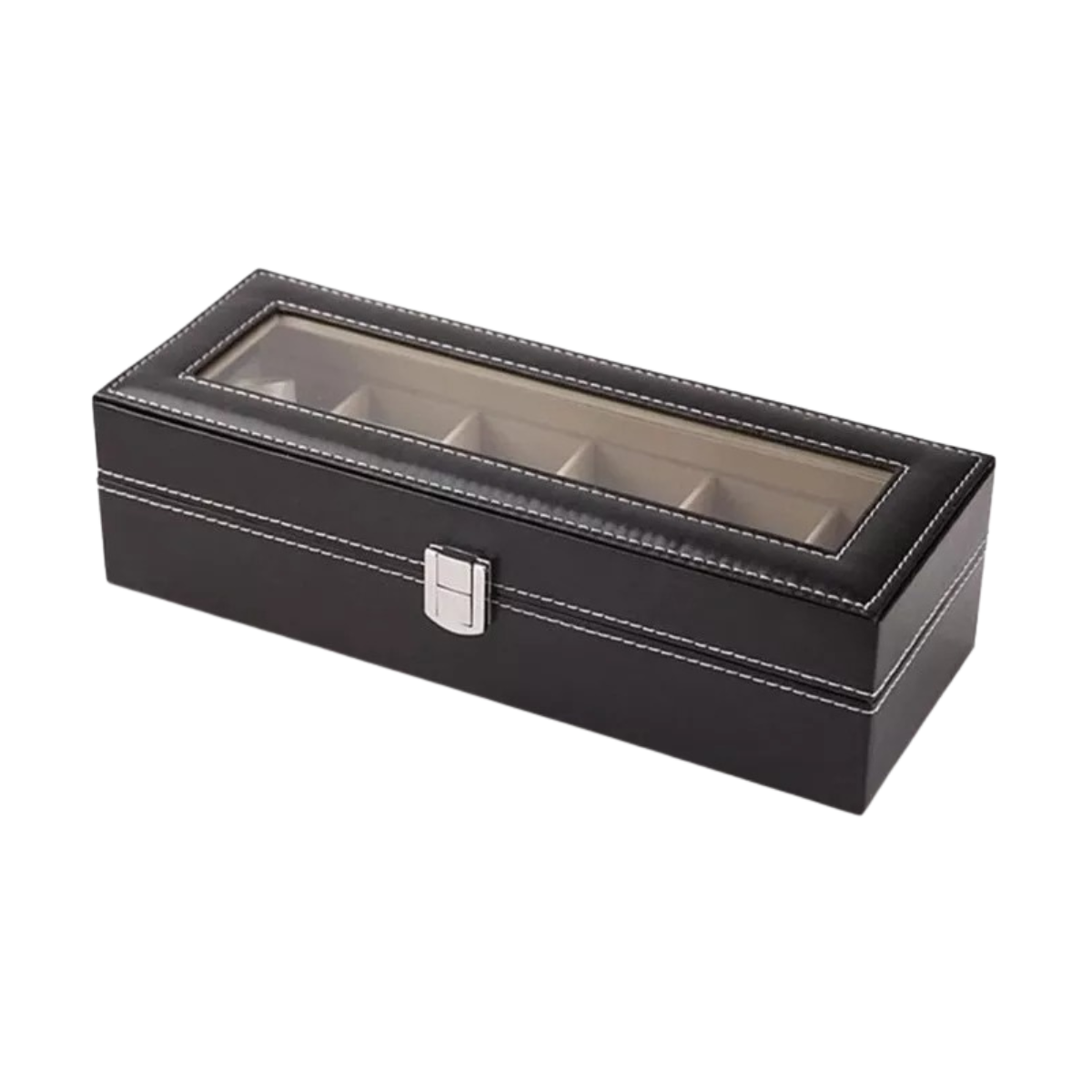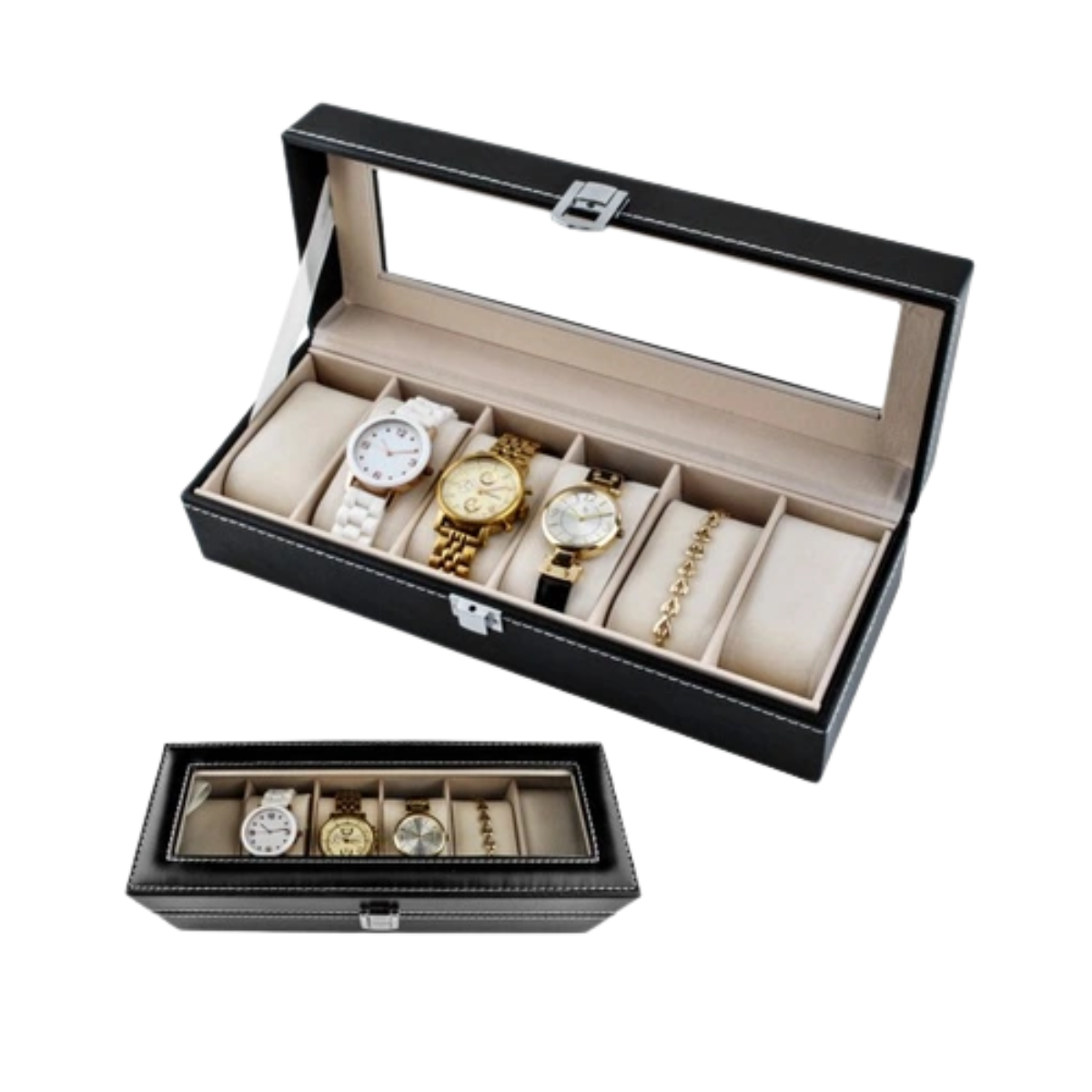 O exterior em couro sintético confere um toque sofisticado, enquanto o interior em camurça proporciona um ambiente acolhedor e seguro para seus relógios. A janela transparente permite que você visualize facilmente suas peças, facilitando a escolha do acessório perfeito para cada ocasião.
