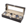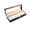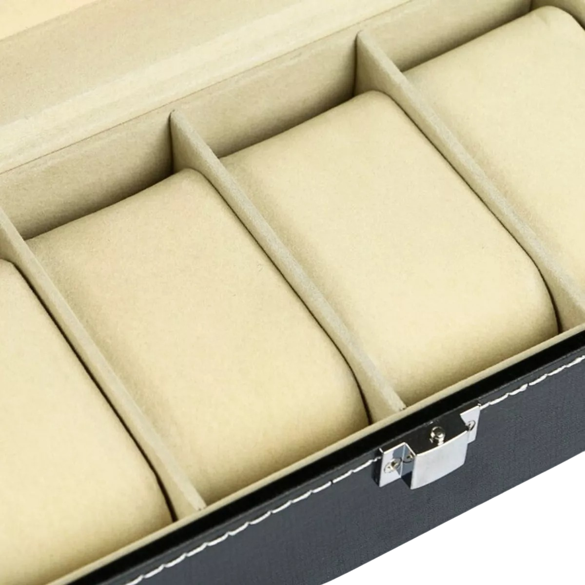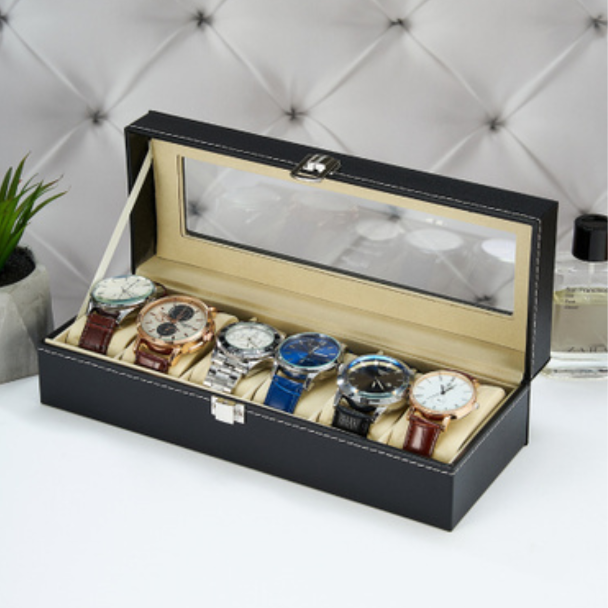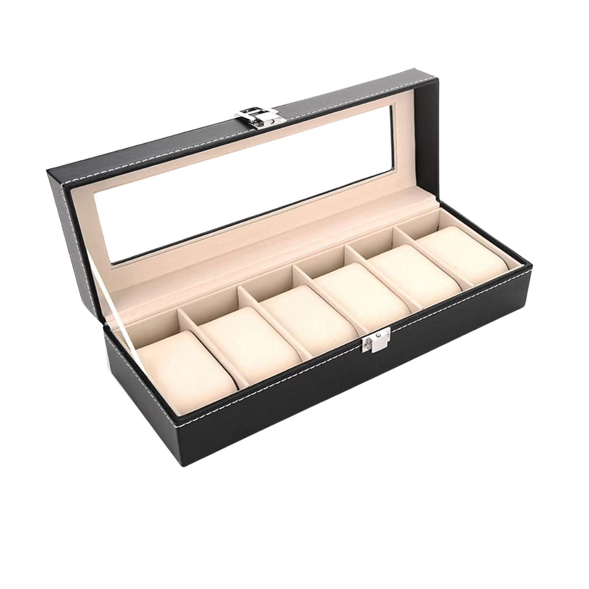 O exterior em couro sintético confere um toque sofisticado, enquanto o interior em camurça proporciona um ambiente acolhedor e seguro para seus relógios. A janela transparente permite que você visualize facilmente suas peças, facilitando a escolha do acessório perfeito para cada ocasião.