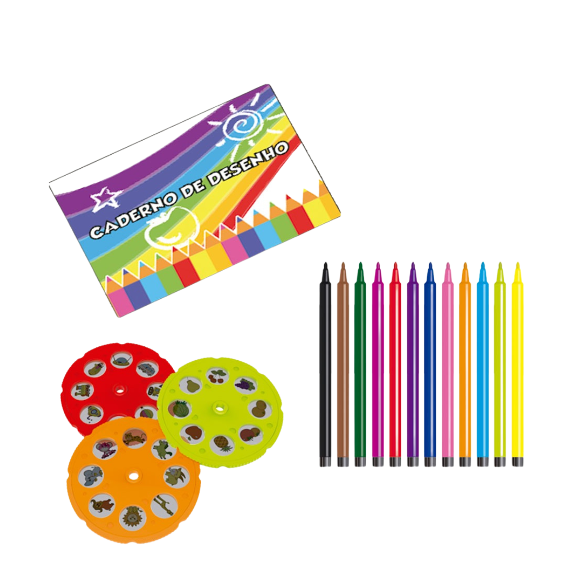 Acompanha 12 canetinhas coloridas. Acompanha caderninho de desenho.
